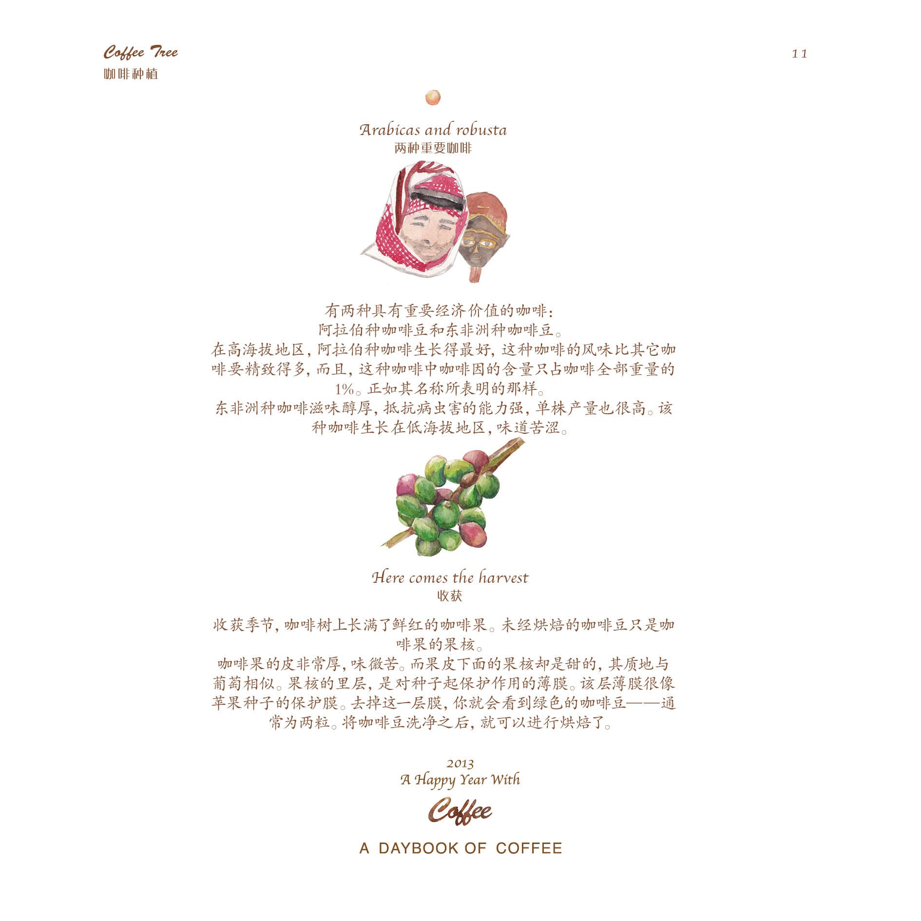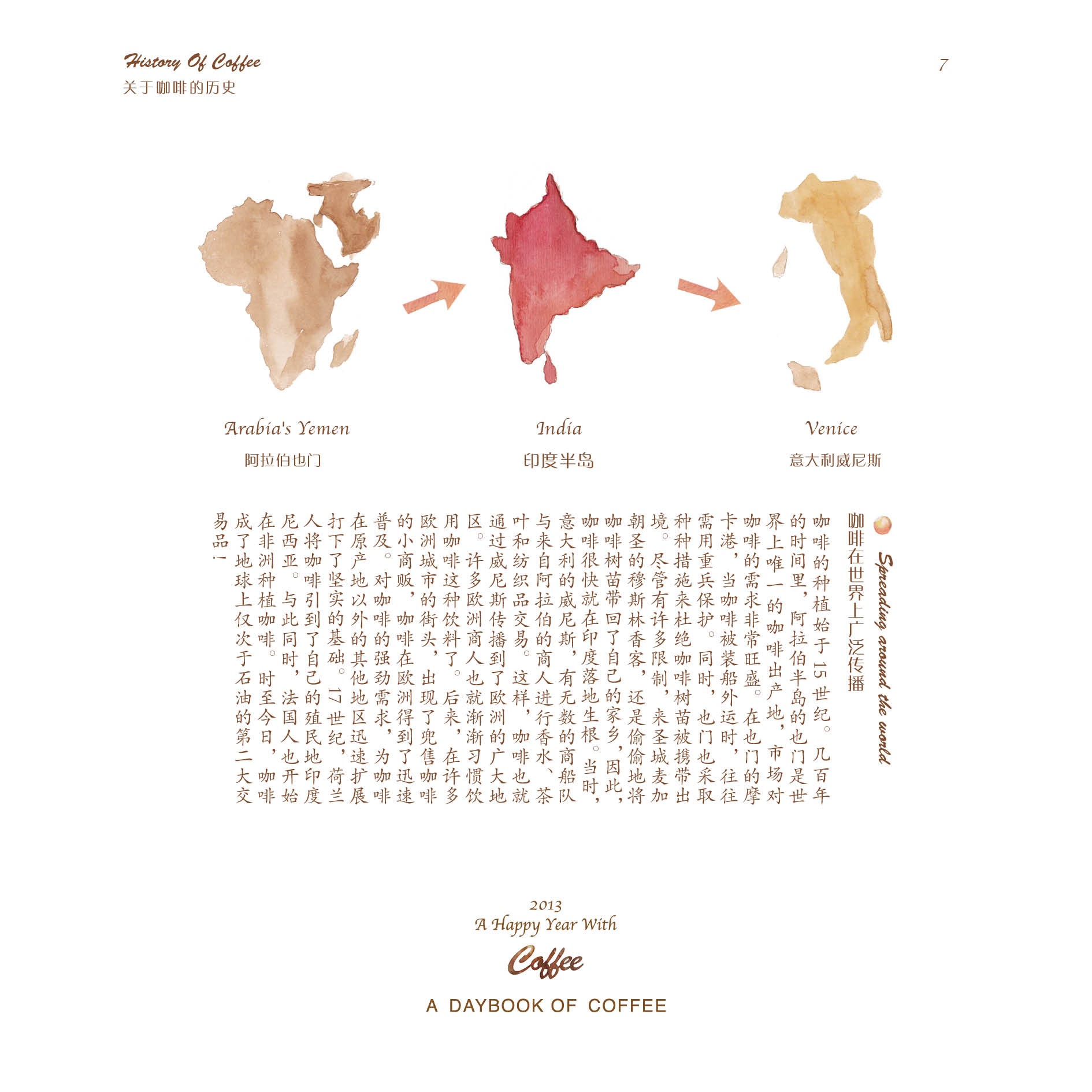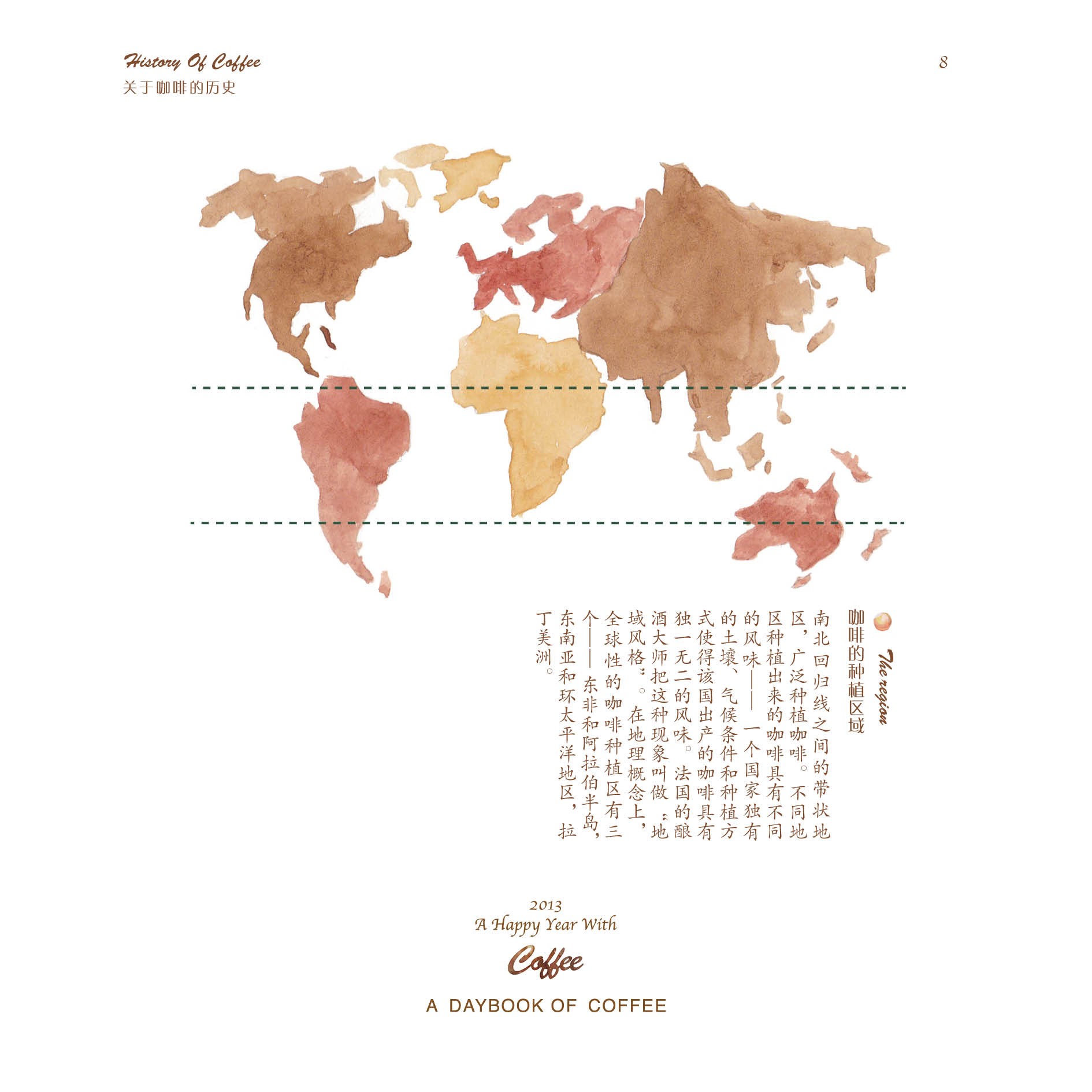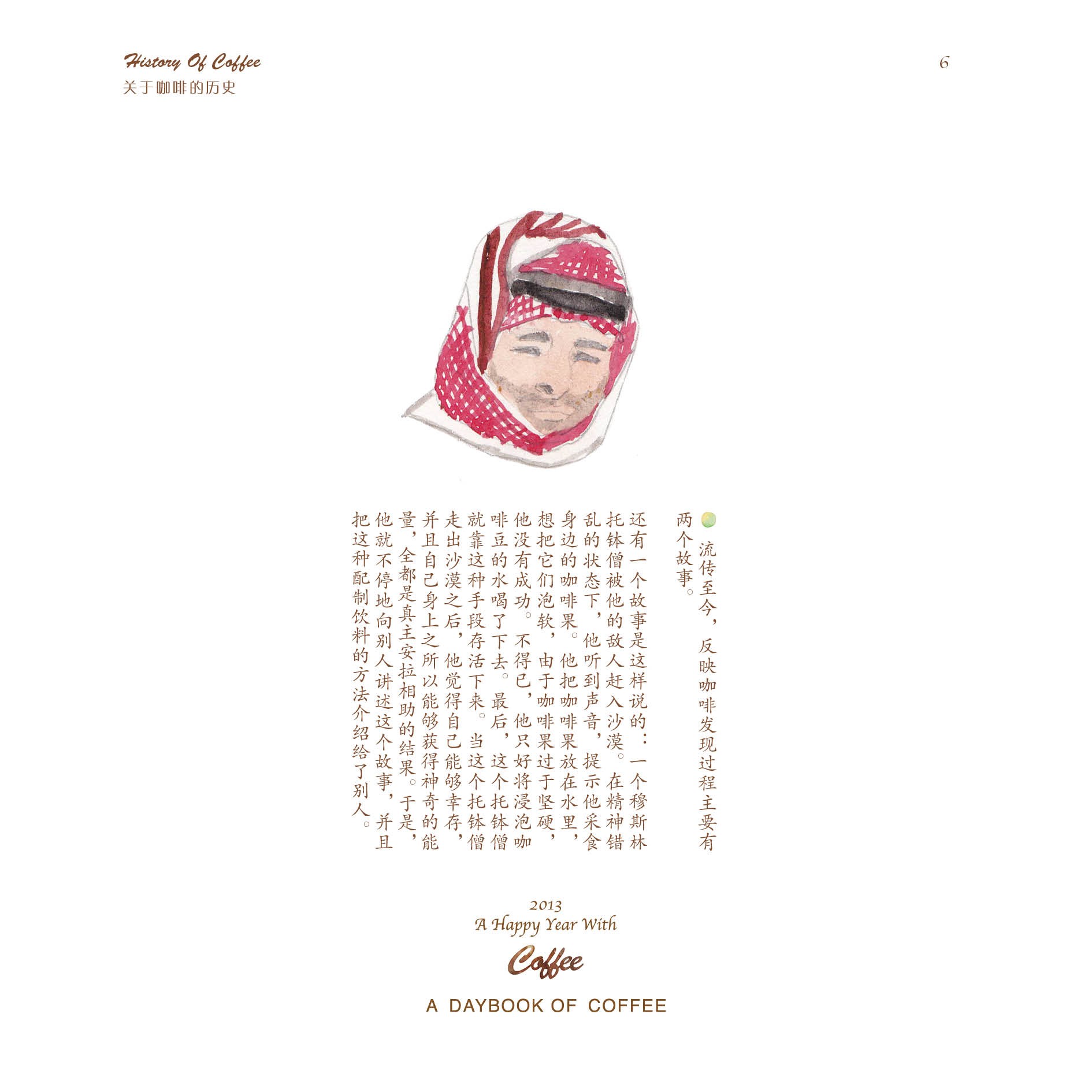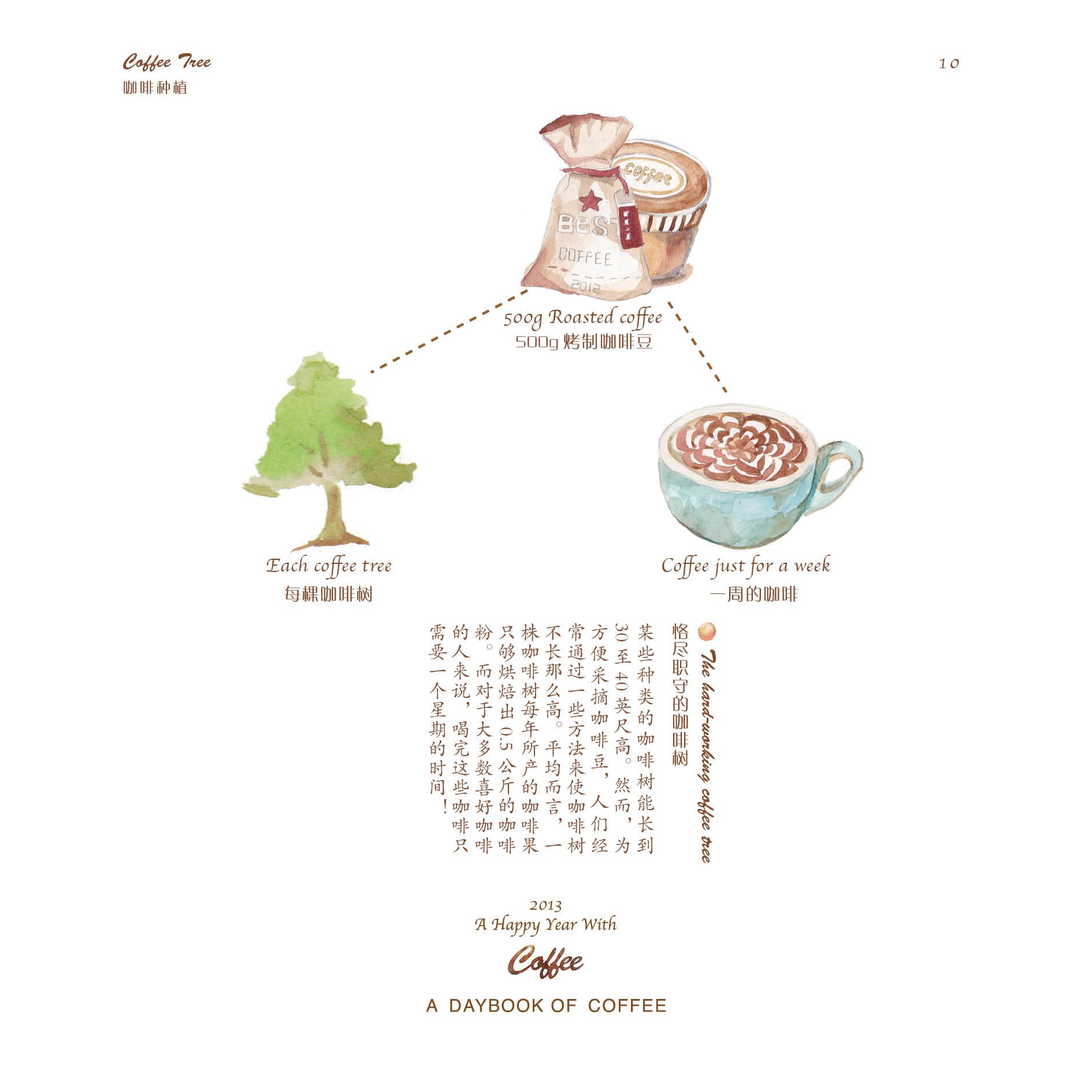 但仅仅只是做一本日历,并不能让蒋冰怡满足。她身边有一位老师特别喜欢咖啡,在老师的影响下,她逐渐对咖啡产生了浓厚兴趣,并决定在日历的后面,制作一本关于咖啡的小册子。于是,她从咖啡的历史、种植、烘焙、调配以及品尝等几个方面着手,上网查找资料,画起插图,并开始讲述咖啡的故事。在整个制作过程中,她都觉得非常有趣,不仅能听听身边朋友们喝咖啡的趣闻,还可以给他们补充新鲜的小知识。