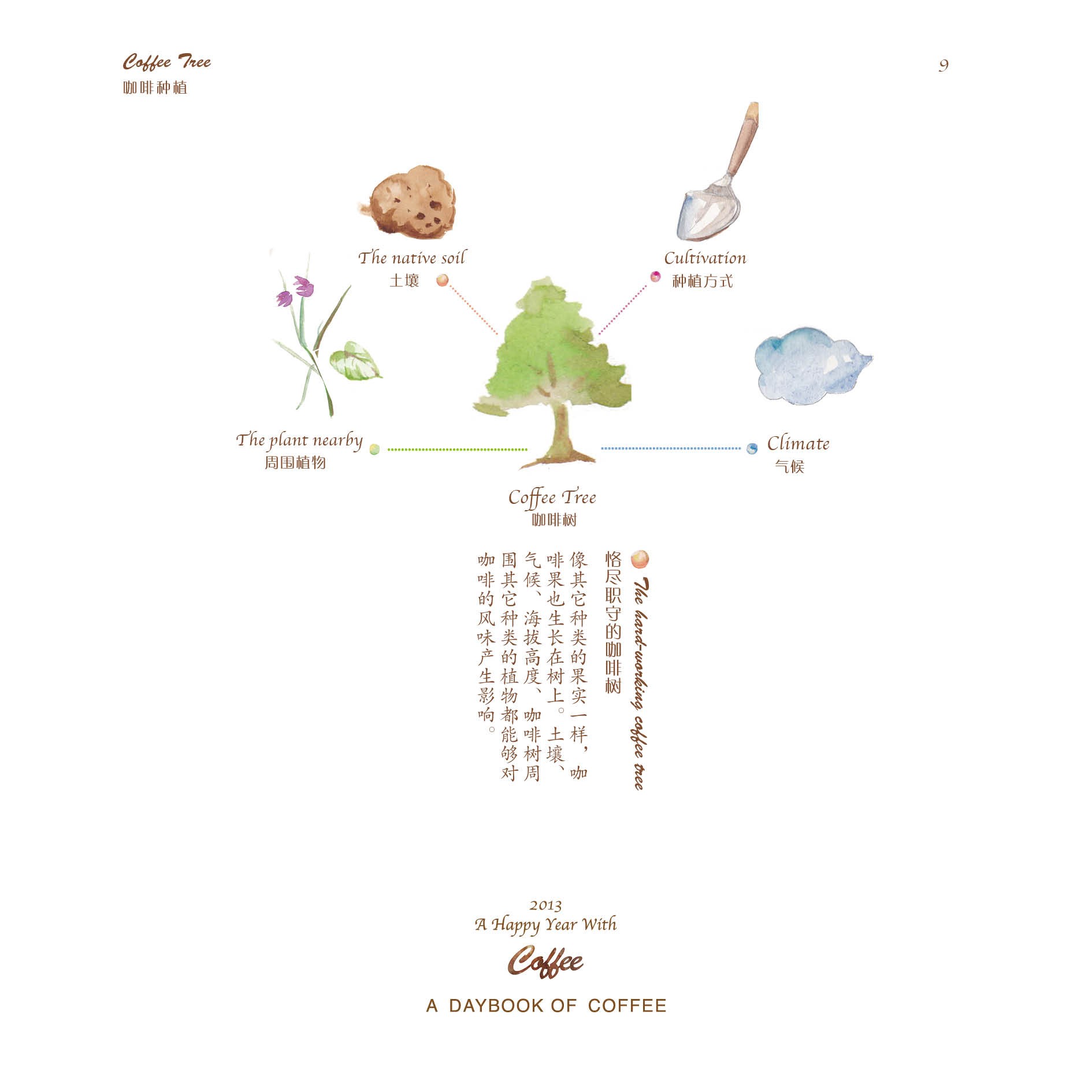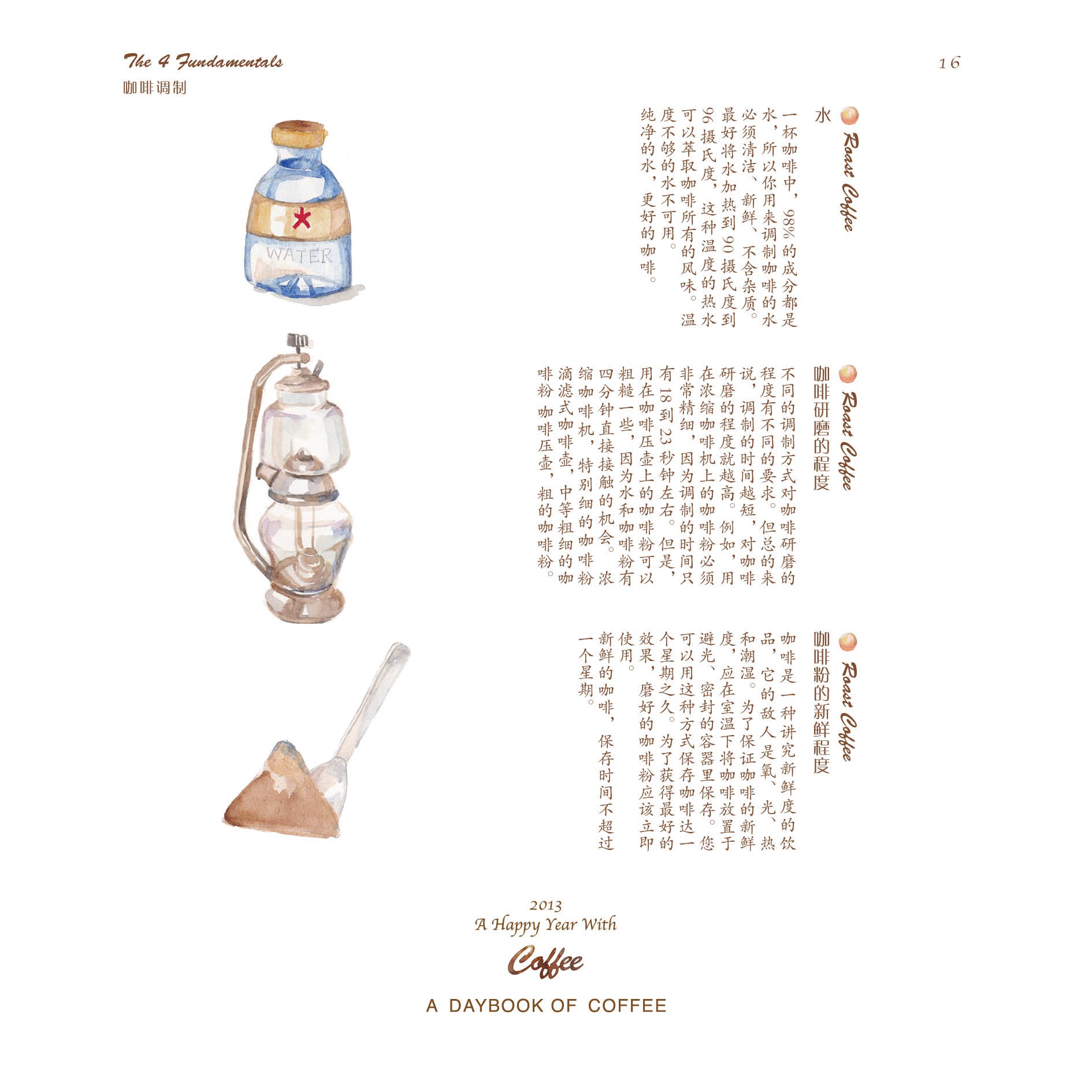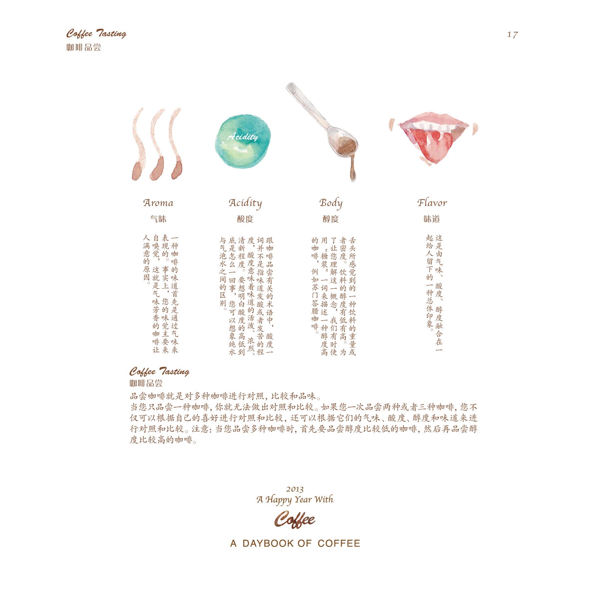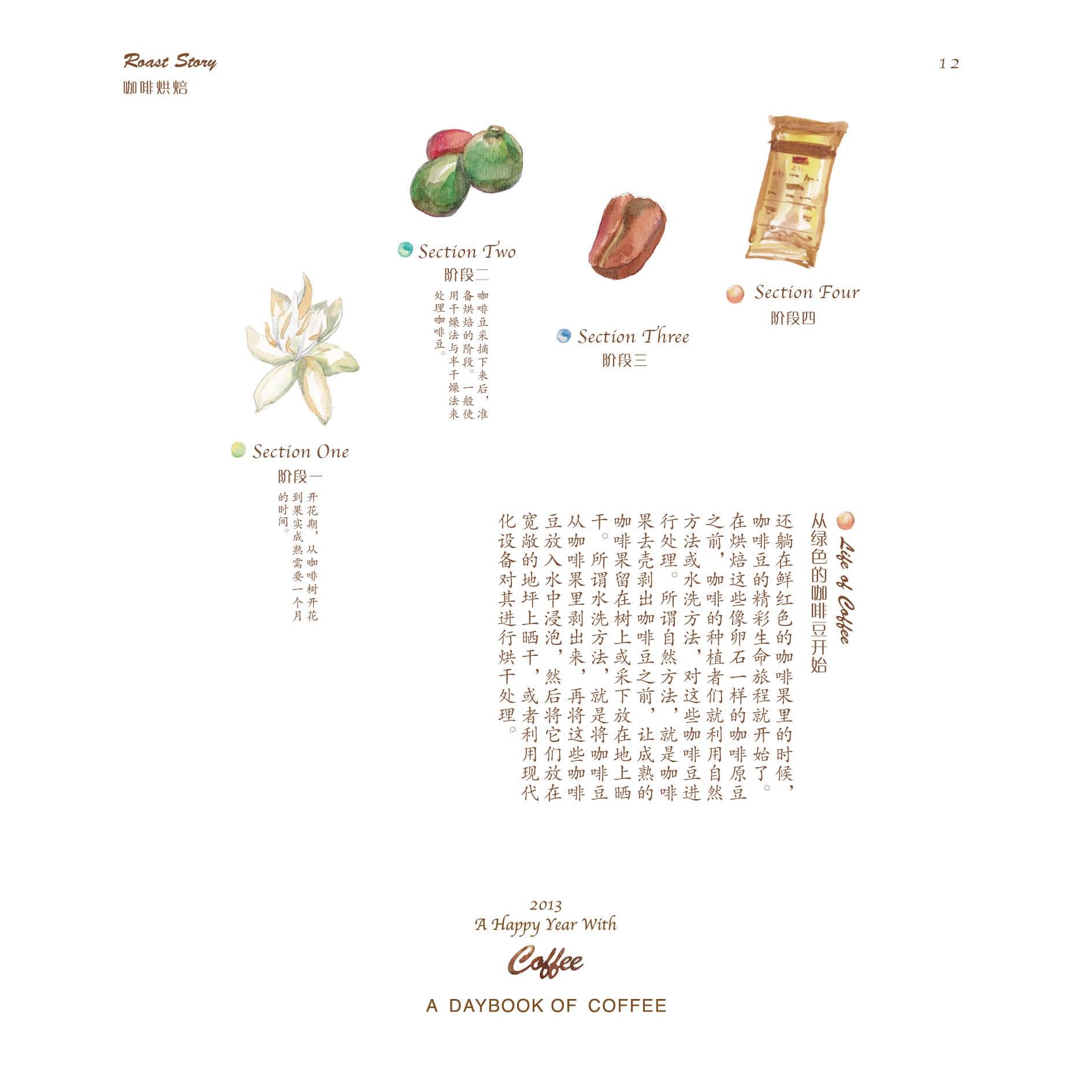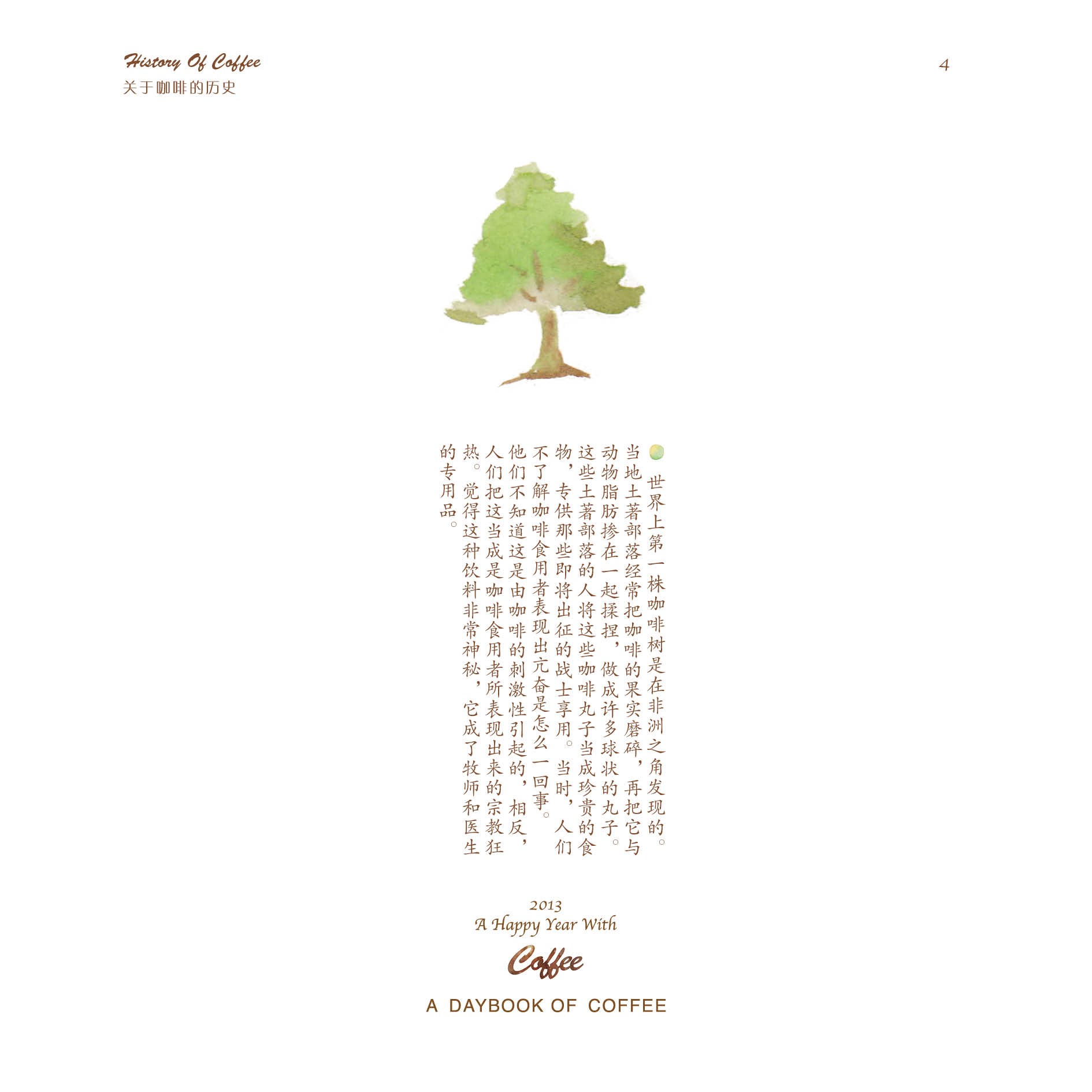 但仅仅只是做一本日历,并不能让蒋冰怡满足。她身边有一位老师特别喜欢咖啡,在老师的影响下,她逐渐对咖啡产生了浓厚兴趣,并决定在日历的后面,制作一本关于咖啡的小册子。于是,她从咖啡的历史、种植、烘焙、调配以及品尝等几个方面着手,上网查找资料,画起插图,并开始讲述咖啡的故事。在整个制作过程中,她都觉得非常有趣,不仅能听听身边朋友们喝咖啡的趣闻,还可以给他们补充新鲜的小知识。