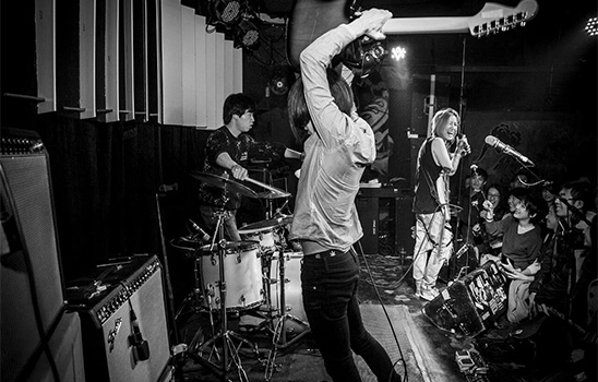 在拥挤的地下排练室,昏暗的灯光,闷热的空气,整个创作的过程可以说很随性。洋阳带去了几个电灯泡,带了一些色纸,并没有用专业的摄影灯,作为装饰光乃至主要照明。手头上并没有鱼眼镜头,但是想拍出非常强的冲击力,所以用了拍风景的手法【全景拼贴】,所以这组作品,是多张照片拼贴而成的。